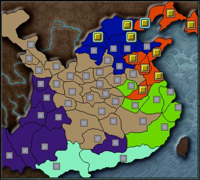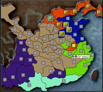北東の柿色が公孫続領、領地はあっても中身スッカスカなショッカー軍です。