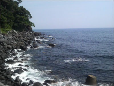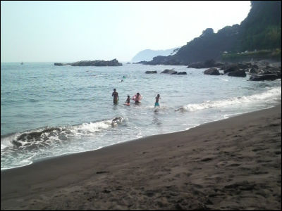 ざぱーん。火山のせいか砂が黒い。